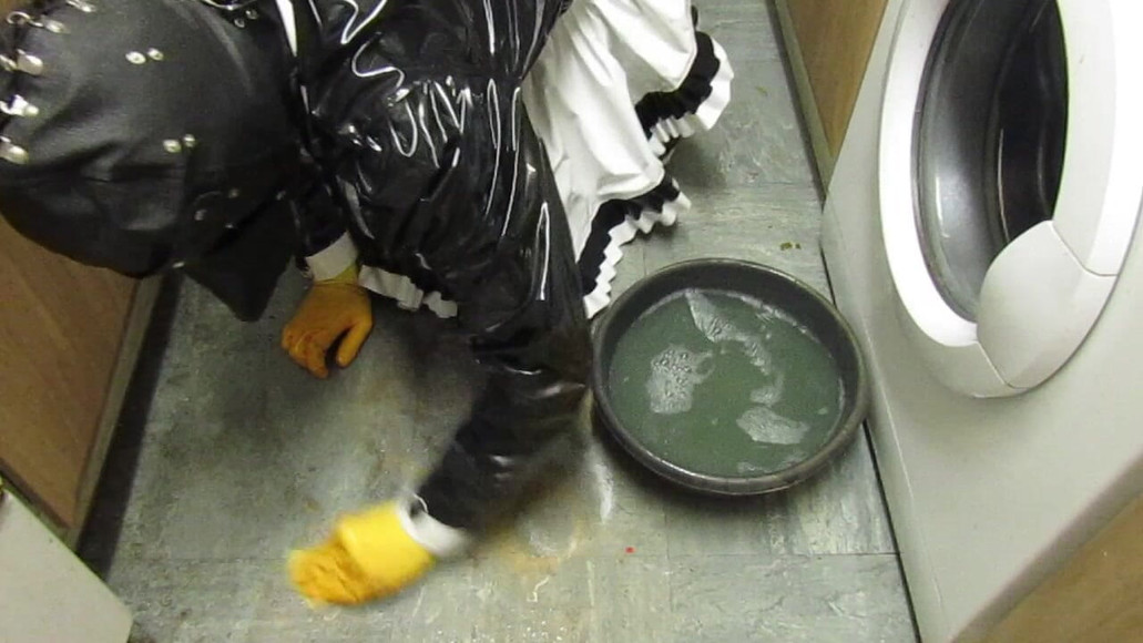 Toilet maid scrubs his filthy kitchen floor clean, in sweaty pvc maids dress with marigolds, and pet mask.